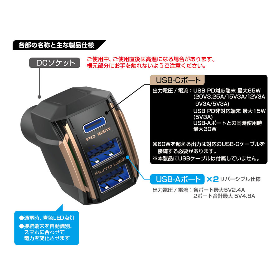 ●商品名:DC-65W USB 3ポート PD65W 自動判定 12V・24V共用 DC-055