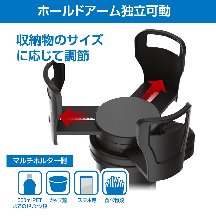 ホールドアームが可動することで、様々なものを置くことができるマルチホルダー。