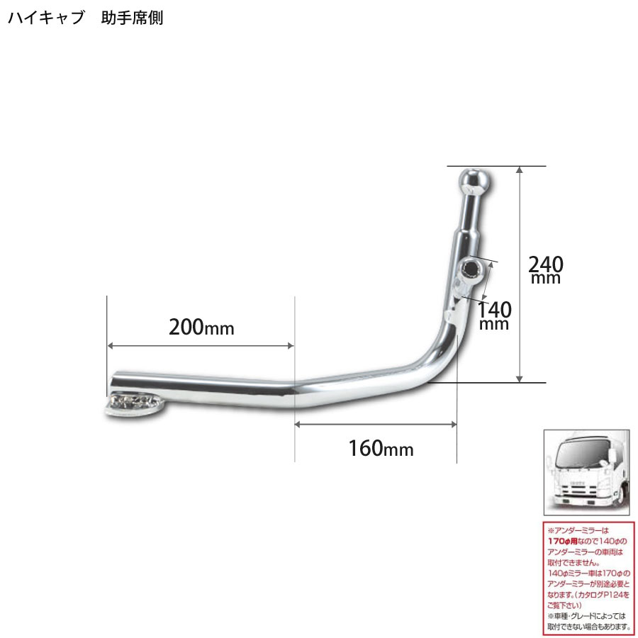 ●商品名:純正タイプ メッキミラーステー 07エルフハイキャブ運転席手動格納・助手席電動格納ロングステータイプ170φアンダーミラー車 H19.1~R5.2