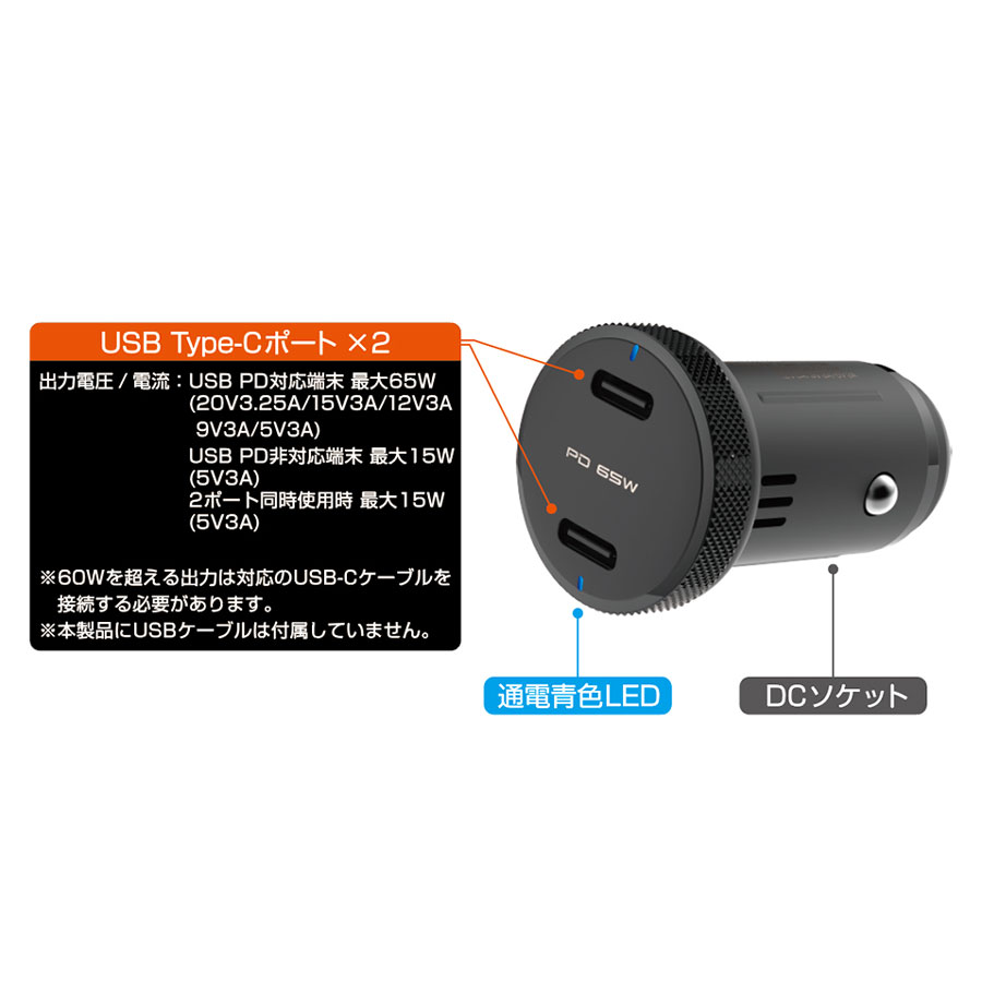 ●規格:・USB PD対応端末 最大65W(20V 3.25A/15V 3A/12V 3A/9V 3A/5V 3A)