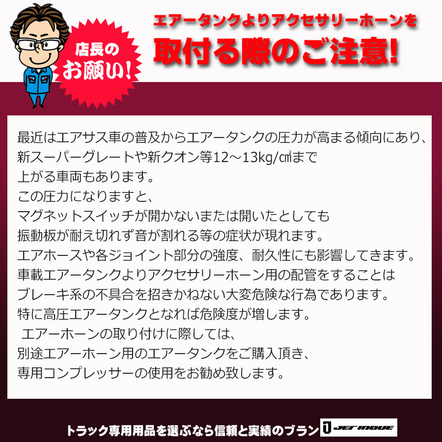 エアーホーンの取り付けに際しては、別途エアーホーン用のエアータンクをご購入頂き、専用コンプレッサーの使用をお勧め致します。